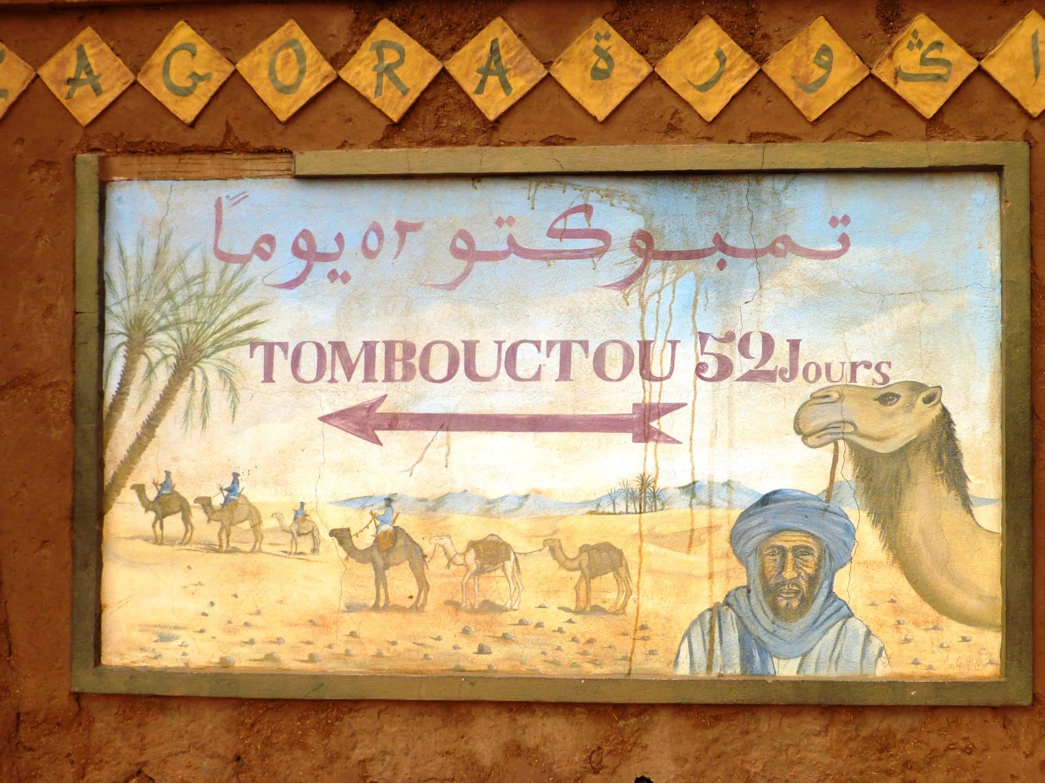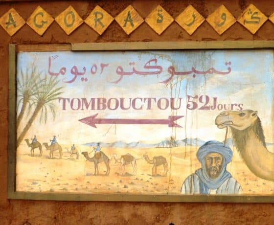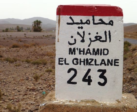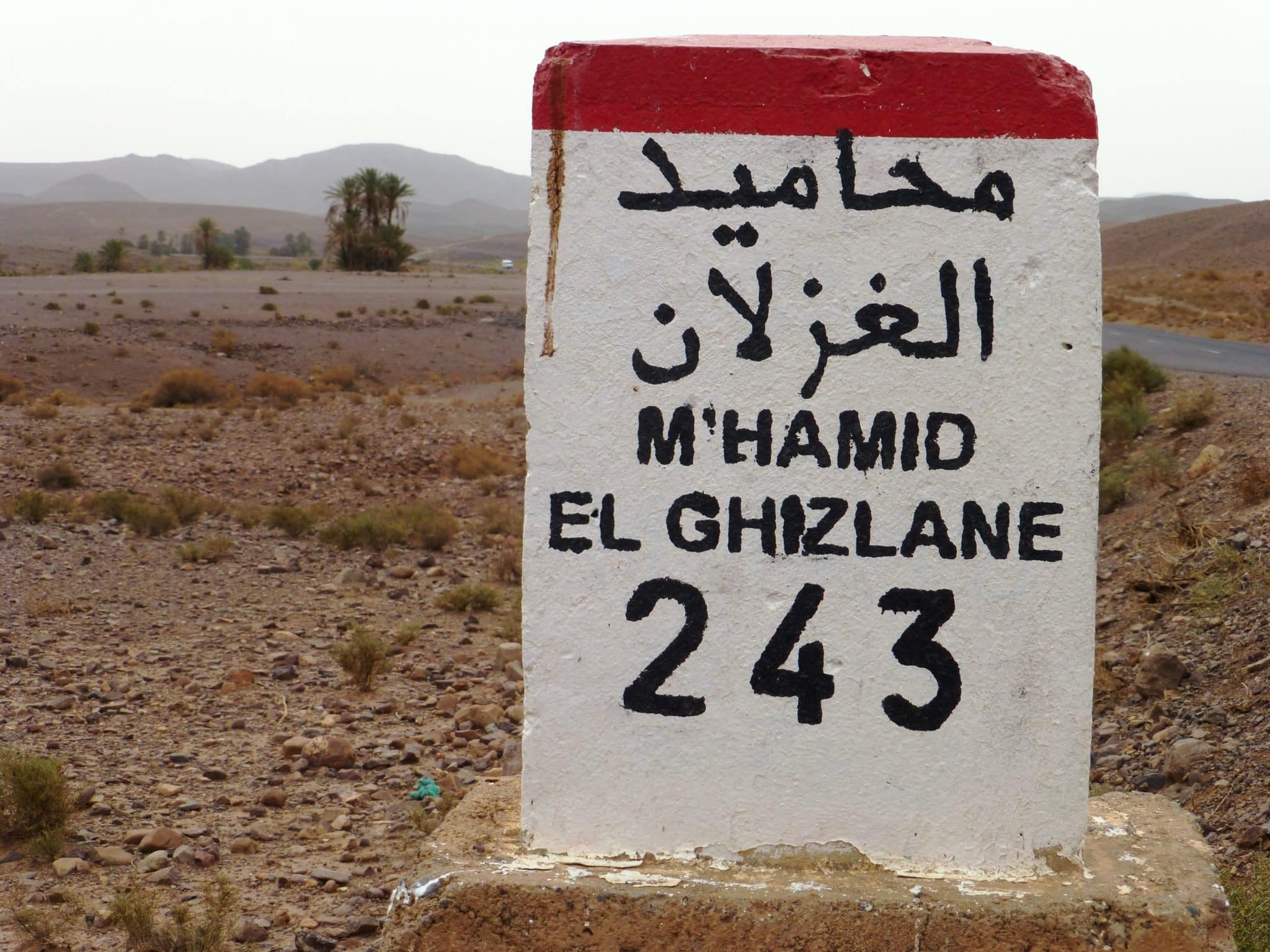 Nous poursuivons notre voyage en traversant le Jbel Saghro par le col de Tizi-n-Tinififft (1660m) et atteignons le village berbère d’Agdz, dominé par le Jbel Kissane reconnaissable par sa forme en plat à tajine. C’est au départ d’Agdz que commence la vallée du Drâa; l’ancienne route des caravanes menant à Tombouctou longe l’oued Drâa sur 200 km d’oasis de palmiers dattiers et vous conduit aux portes du désert. Nous traversons Zagora, la capitale de la province. C’est la dernière grande halte avant le Sud Saharien – toute la mythologie et la fascination du désert, comme en témoigne ce célèbre panneau à la sortie de Zagora : «Tombouctou 52 jours». Continuation vers les villages présahariens Ouled Driss et M’Hamid, terme de la route goudronnée aux portes du Sahara.