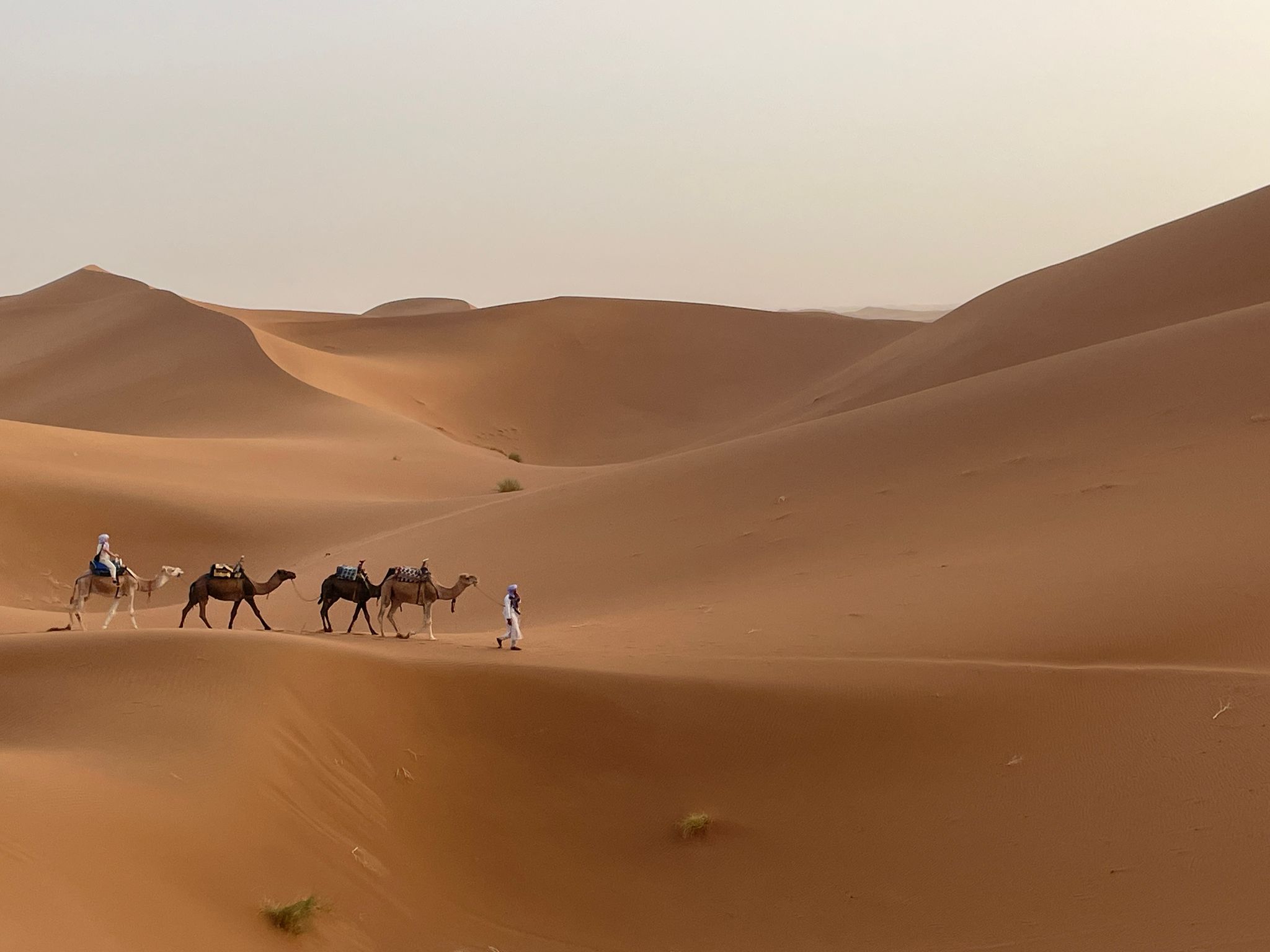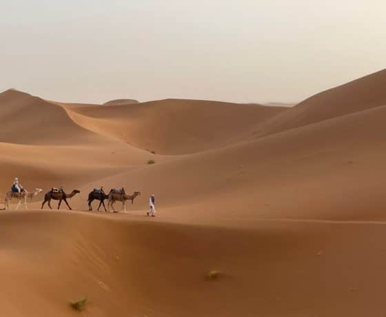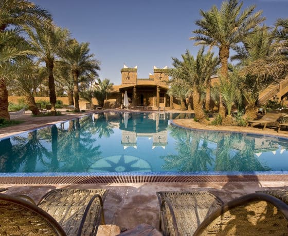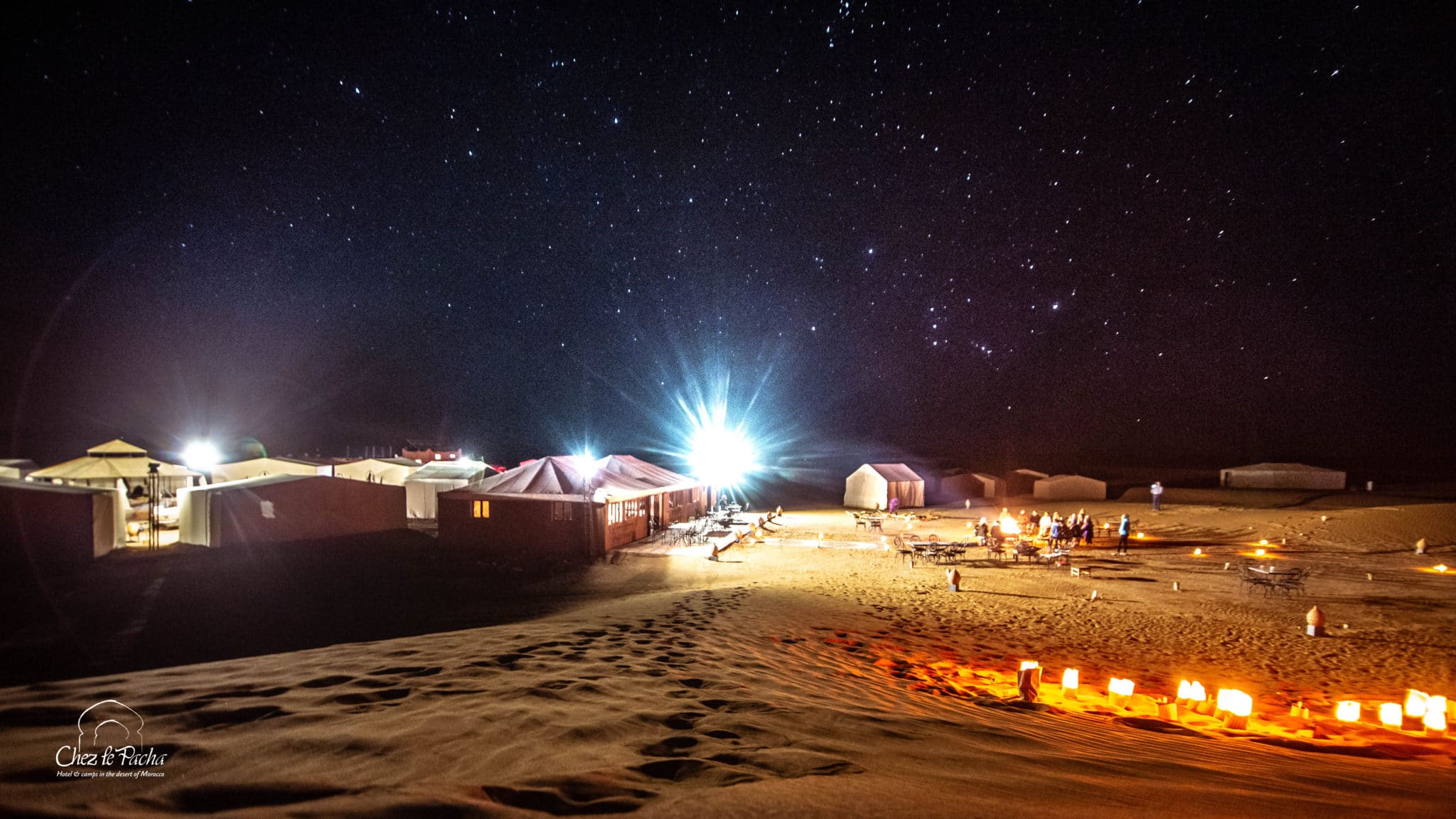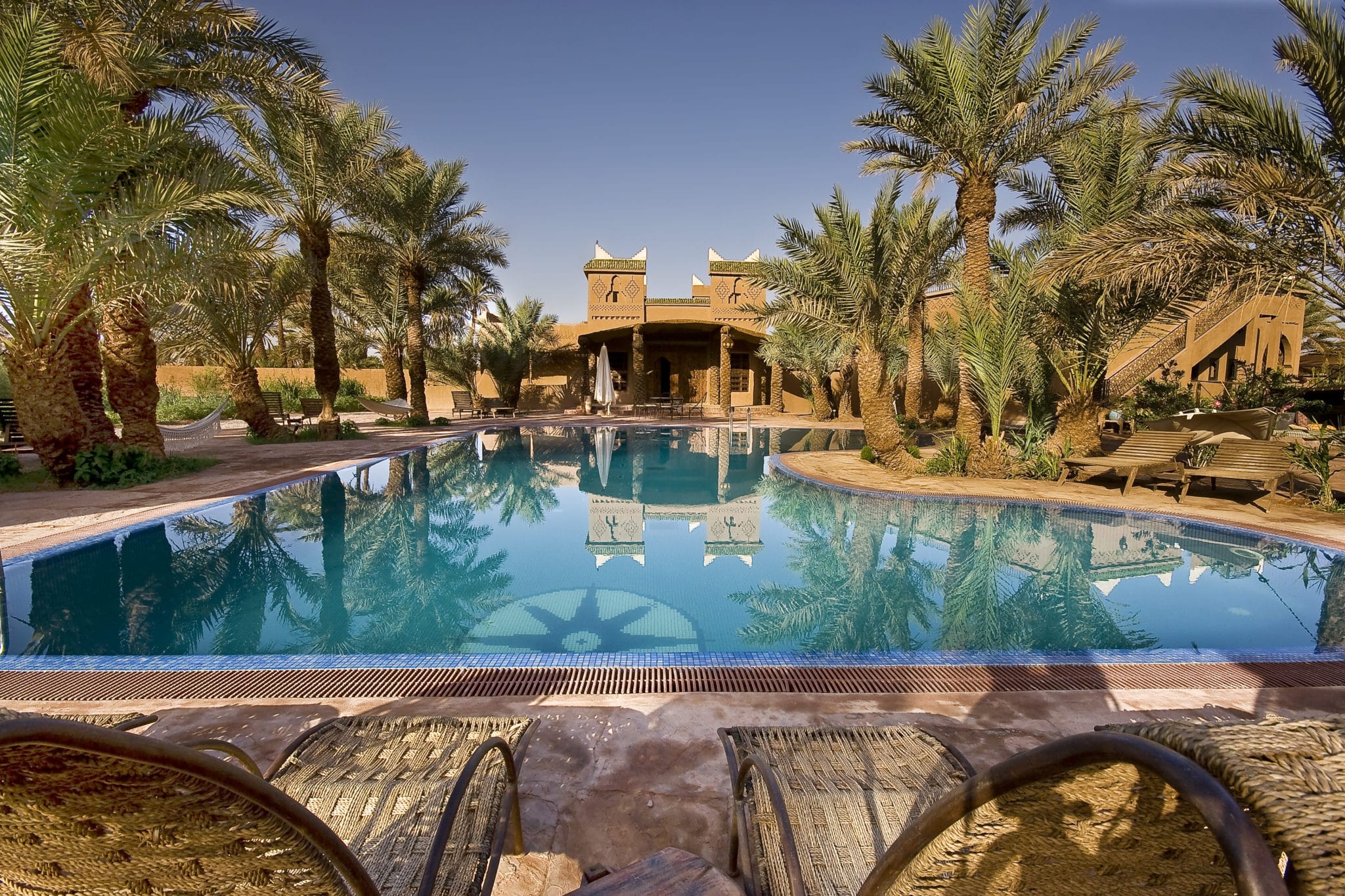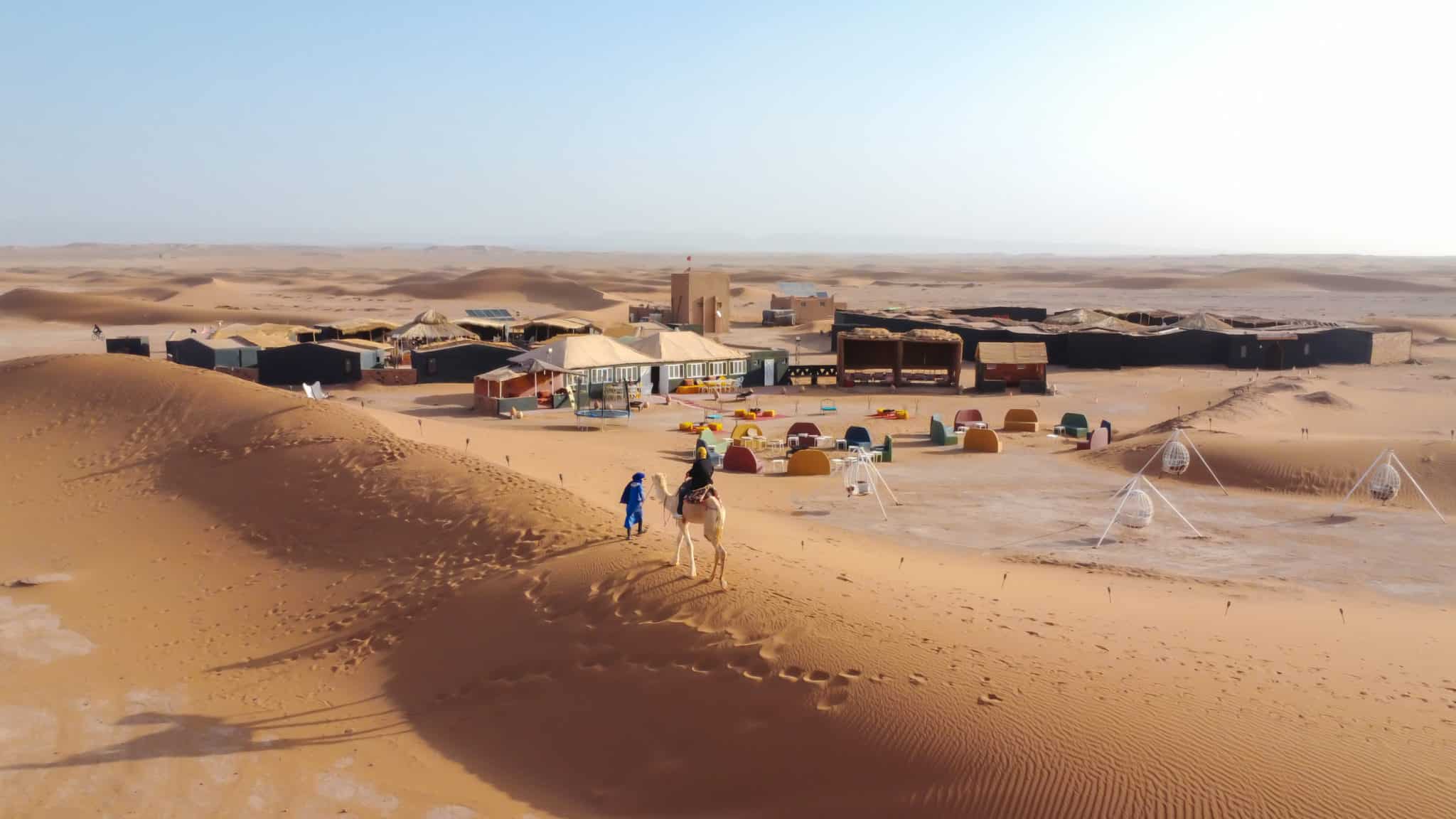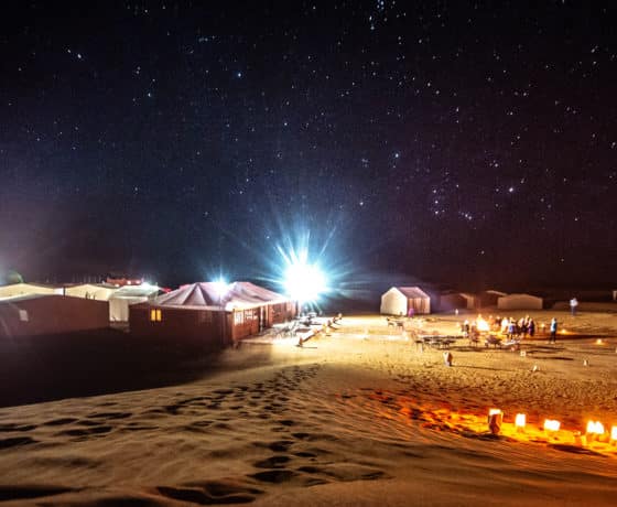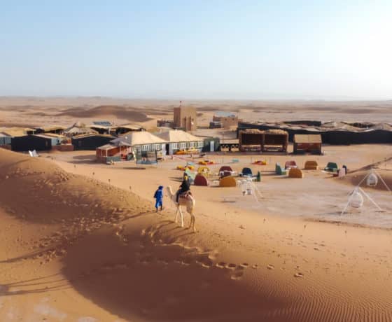 Après le petit déjeuner, promenade à dos de dromadaire à travers la Palmeraie et son système oasien et visite d’un vieux village berbère encore intact. Après un thé servi dans une kasbah avoisinante, retour à l’hôtel, où le déjeuner vous attend. Détente au bord de la piscine, avant le départ en 4×4, par la piste sablonneuse, direction les grandes dunes de Chegaga. Elles constituent la plus belle partie du désert marocain ; formant une magnifique mer de sable, elles s’étendent sur env. 40 km de long et 15 km de large, et s’élèvent jusqu’à 60 mètres. Arrivée à temps au bivouac pour assister au coucher du soleil – spectacle en haute définition – et vivre une féerie incomparable depuis le haut de la grande dune.
