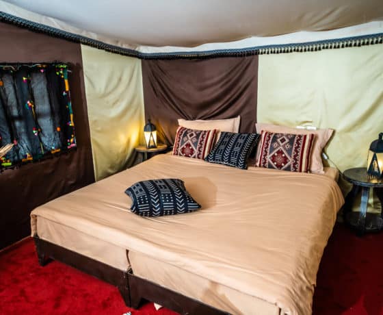 11 tentes (7.20 m x 3 m) d’une capacité de 3 personnes avec douche, toilettes et terrasse privée équipée d’une table et de fauteuils.